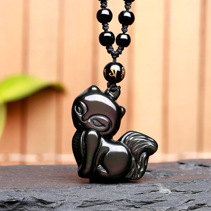 Natural Golden Obsidian Nine-Tailed Fox Pendant – Rainbow Eye Black Obsidian Necklace for Women