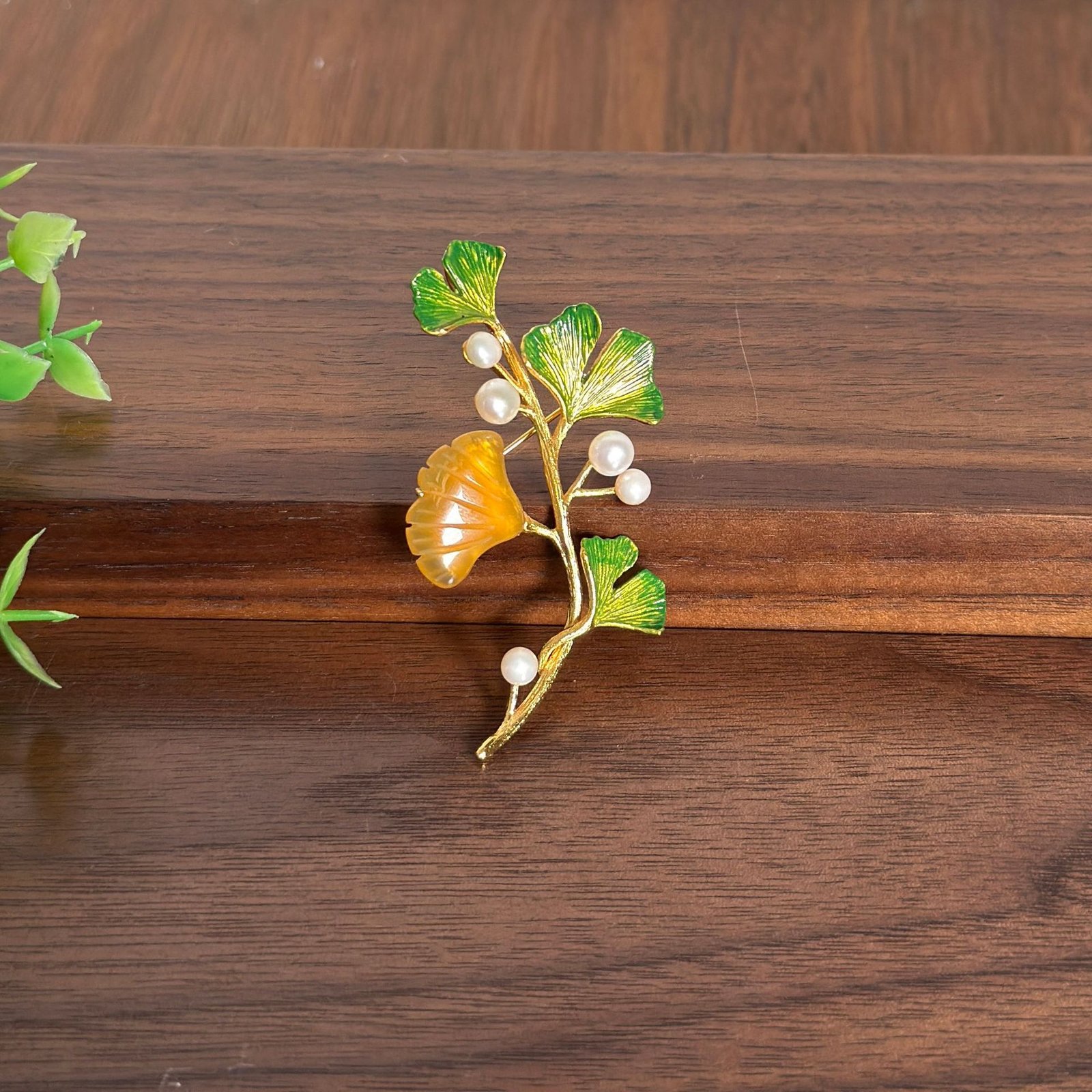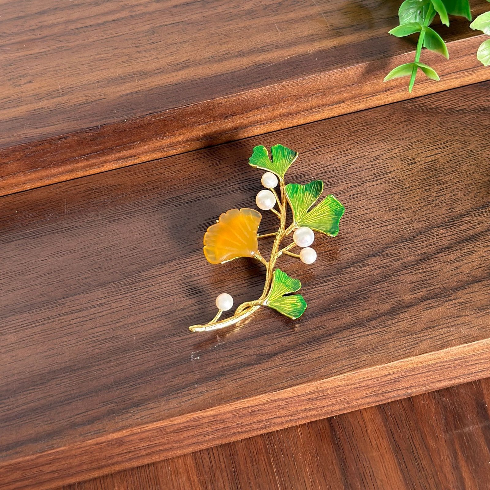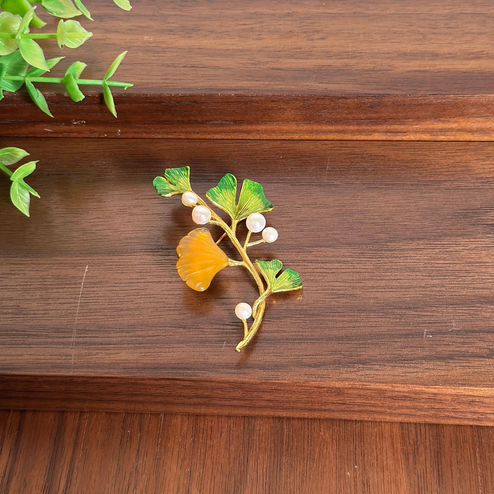 One Leaf Knows Autumn’ Chinese Style Chalcedony & Pearl Brooch – Vintage Designer Women’s Accessory