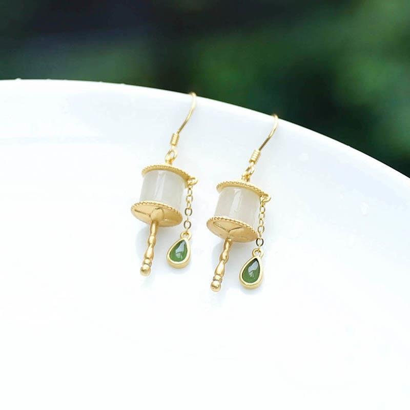 Tibetan Prayer Wheel Hotan Jade Earrings – 925 Silver Tassel, Ethnic Style