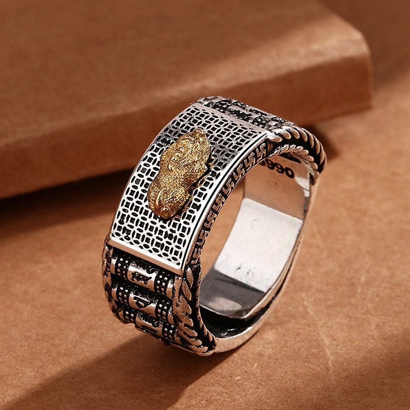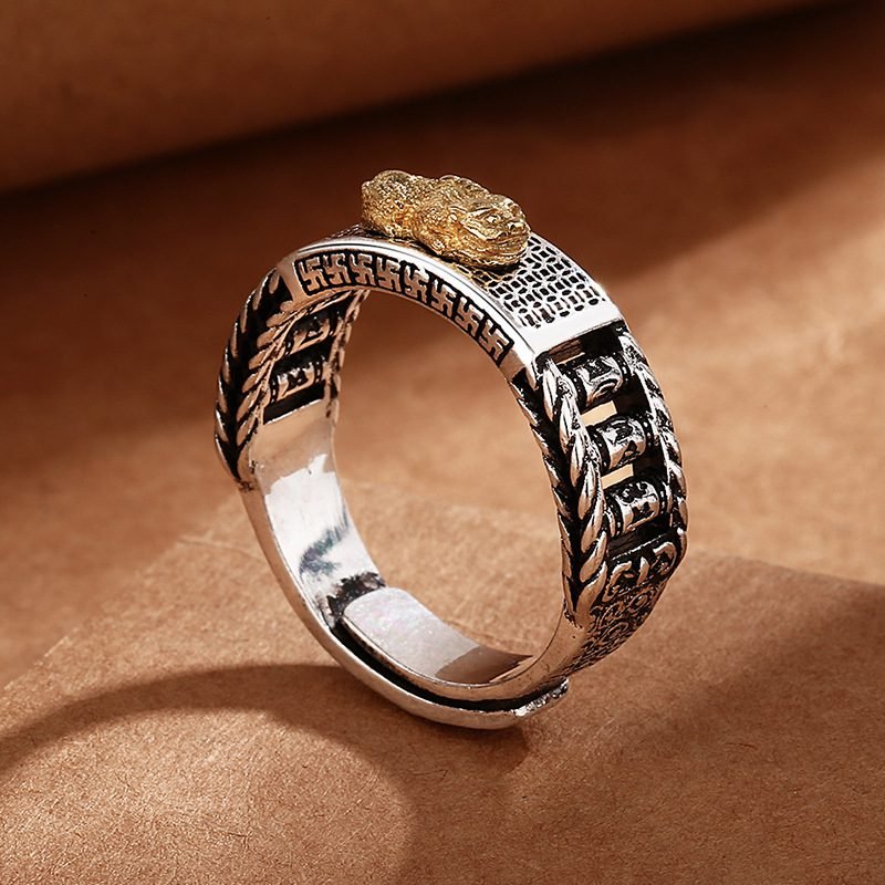 Vintage Silver Pi Xiu Rotating Ring – Adjustable Couple Ring with Buddhist Mantra for Men & Women