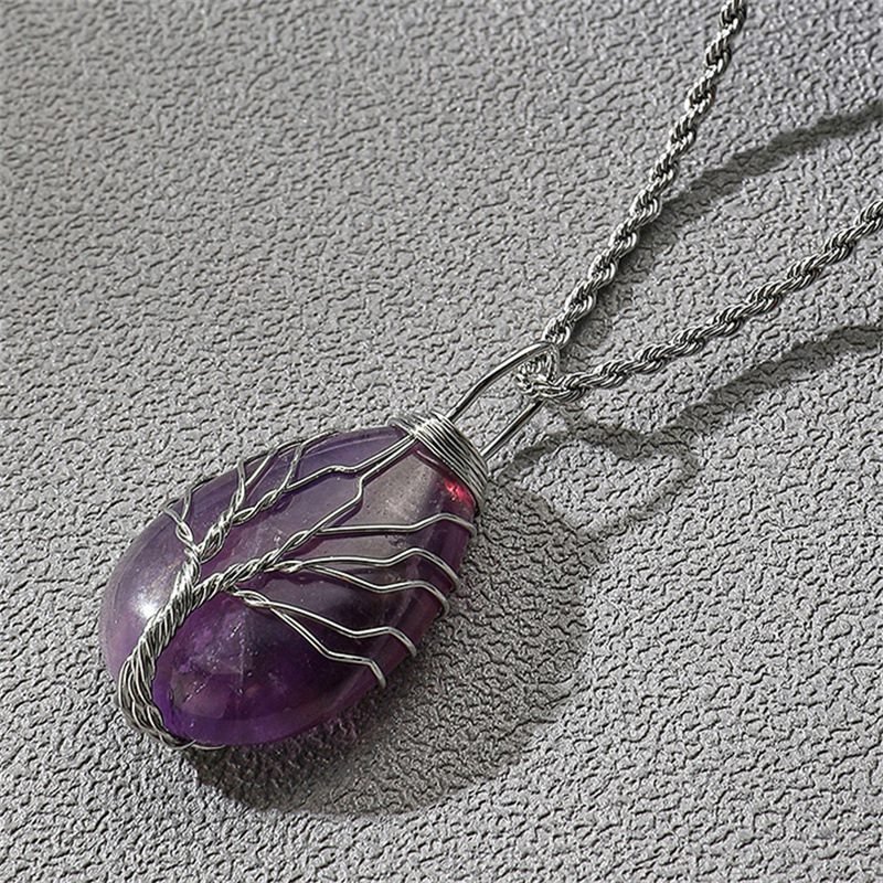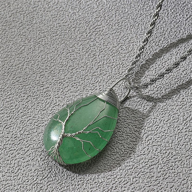 Hot-Selling Unisex Natural Stone Necklace – Handmade Wire-Wrapped Tree of Life Teardrop Pendant, Wholesale Jewelry